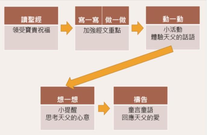 課程內容設計綜合主題式、歸納式、體驗式和評量式,以活潑、互動的方法讓小朋友能夠理解真理,培養孩子靈修的興趣,並建立親子靈修的好習慣。